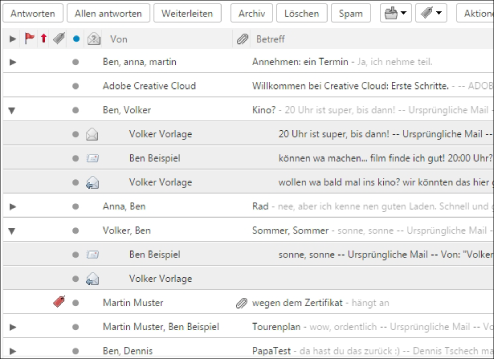 planetarymail kann E-Mail Dialoge in s.g. Gespräche zusammenfassen. So sehen Sie z.B. anstelle von 30 Mails von Volker in der letzten Stunde nur eine einzige Zeile. Das ist toll, denn Sie bleiben produktiv und können leichter andere benötigte Informationen überblicken. Und sollten Sie während der Konversation einen Anhang geschickt bekommen, können Sie diesen jederzeit mit nur einem Klick an Ihre neue Mail anhängen.